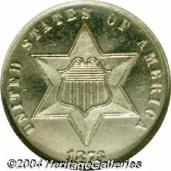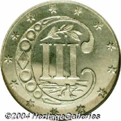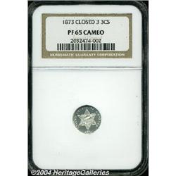 <B>1873<3CS> PR65 Cameo NGC.</B></I> Sparkling proof brilliance with a completely brilliant-white finish and nicely frosted devices. Just a few tiny, non-distracting hairlines are detected in the vulnerable fields that limit the already high grade. Popular final year of the denomination, and struck only as proofs. <BR><BR><B>Important notice:</B> Heritage usually auctions material at the rate of 200-250 lots per hour. On some occasions eBay Live bid software or the Internet may not be able to keep up with the pace of the auction. We recommend placing a realistic absentee bid now as insurance to avoid disappointment. Occasionally the auctioneer may eliminate or reject an eBay Live bid, and the auctioneer may also reopen a lot after the close of the eBay live bidding (usually because we missed an audience bid), and may reject your bid even if it shows you as the winning bidder. By bidding via eBay Live, you agree that Heritage may award the lot to another bidder at its sole discretion under the circumstances described above or any other reasonable circumstances. Since eBay bids are not shown to us until we open the lot on the floor, we treat those bids just like floor bids. In most cases the floor responds before the eBay bid is presented to us, due to Internet lag time, so for consistency we have made it a policy that floor bids are always considered first over tie eBay live bids. Also please note that all Heritage lots purchased through eBay Live carry a 20% Buyer's Premium. Please make sure you read the Terms and Conditions before you bid.