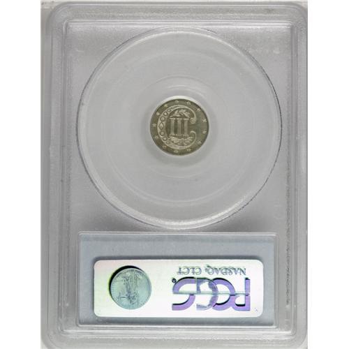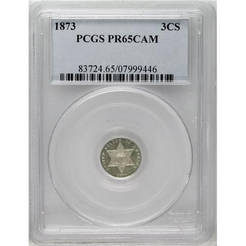 <B>1873 3CS PR65 Cameo PCGS.</B></I> Essentially brilliant with outstanding depth of mirrored reflectivity that initiates the contrast on this flashy, final-year trime. A few pinpoint disturbances in the obverse fields appear to be mint-caused. While a reasonably obtainable proof-only issue, the number of Gem Cameo proofs is extremely limited. Population: 6 in 65, 2 finer (12/06).<BR><BR><b>Shipping:</b> Coin/Currency (<a target="_blank" href="http://www.heritageauctions.com/common/shipping.php">view shipping information</a>)
