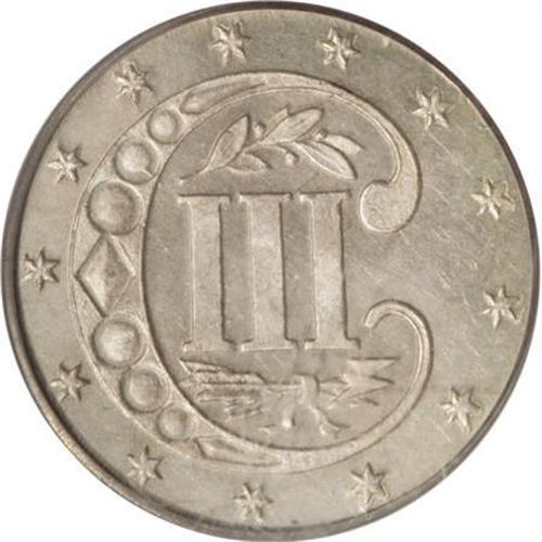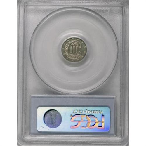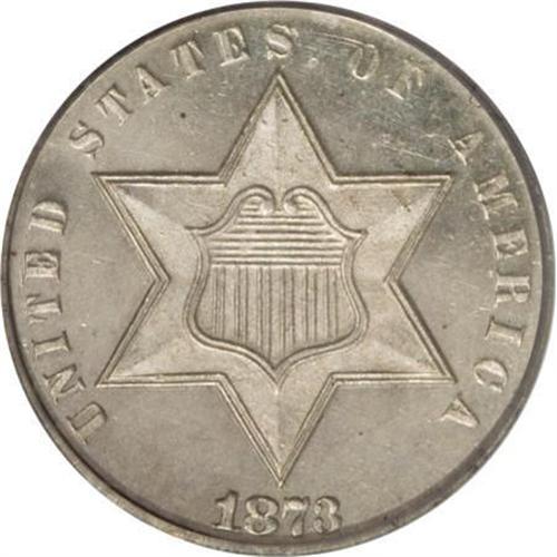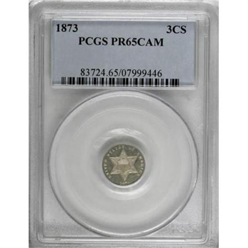 <B>1873 3CS PR65 Cameo PCGS.</B></I> One of the most enticing survivors from this proof-only issue of just 600 pieces, this specimen exhibits rich frost on the sharply struck devices. Both sides show excellent contrast despite a measure of cloud-gray haze that has settled over the fields. Pleasingly preserved with only a few scattered planchet flaws. Population: 5 in 65 Cameo, 2 finer (8/07).<I><BR>From The Beau Clerc Collection.</B></I><BR><BR><b>Shipping:</b> Coins & Currency (<a target="_blank" href="http://www.heritageauctions.com/common/shipping.php">view shipping information</a>)