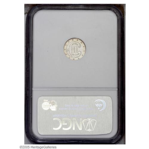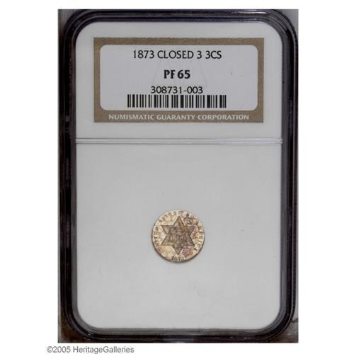<B>1873<3CS> PR65 NGC.</B></I> Mottled golden-brown and lavender patination bathes the obverse, while the reverse remains largely untoned. Each side displays a cameo-like effect resulting from the strong field to motif contrast. Sharply struck with no significant marks. Population: 63 in 65, 29 finer (9/05).