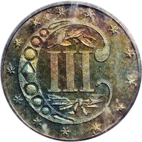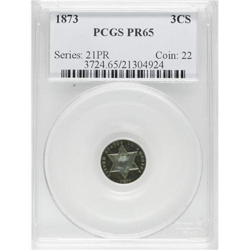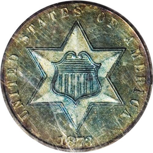 <B>1873 3CS PR65 PCGS.</B></I> Both sides display deep sea-green, rose, and citrine toning that enhances the effect of the flashy fields. A sharply struck and delightful representative, carefully preserved with no significant distractions. The business strike mintages for successive trime issues formed a downward spiral, and the 1873 issue was proof-only, which took the fall to its ultimate conclusion.<BR><BR><b>Shipping:</b> Coins & Currency (<a target="_blank" href="http://www.heritageauctions.com/common/shipping.php">view shipping information</a>)