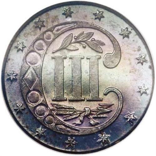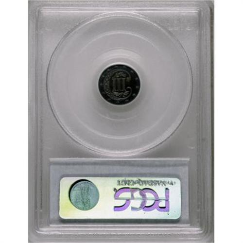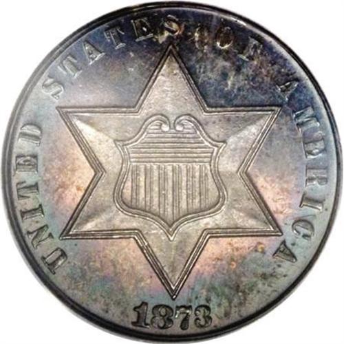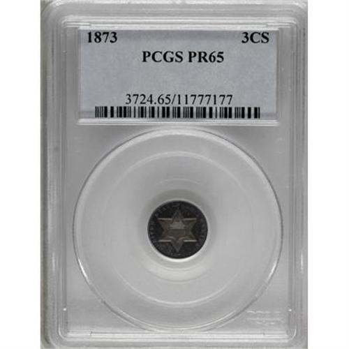 <B>1873 3CS PR65 PCGS.</B></I> When the fate of the three cent silver denomination was finally sealed in 1873, business strikes had already been phased out and just 600 proofs were reportedly issued. This well mirrored Gem is richly toned in violet and sea-green shades and shows only a few mint-caused imperfections in the fields. Population: 52 in 65, 13 finer (7/07).<BR><BR><B>Coin Engraver:</B> James B. Longacre<BR><BR><b>Shipping:</b> Coins & Currency (<a target="_blank" href="http://www.heritageauctions.com/common/shipping.php">view shipping information</a>\)