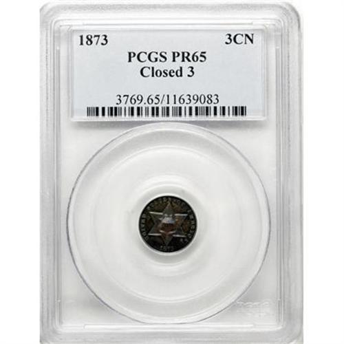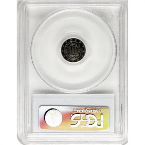<B>1873 3CS PR65 PCGS.</B></I> Deep electric-blue and rose toning covers each side of this visually alluring Gem proof example. The design elements are crisply and fully rendered throughout, and there no bothersome hairlines or contact marks to be found. Population: 53 in 65, 13 finer (12/07).<BR><I>From The Madison Collection.</B></I><BR><BR><B>Coin Engraver:</B> James B. Longacre<BR><BR><b>Shipping:</b> Coins & Currency (<a target="_blank" href="http://www.heritageauctions.com/common/shipping.php">view shipping information</a>)