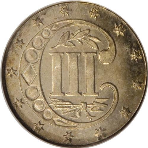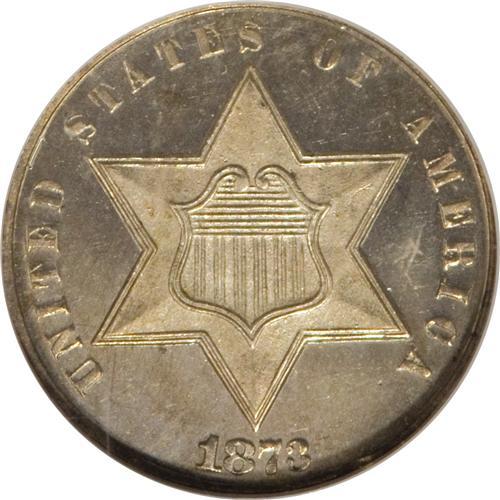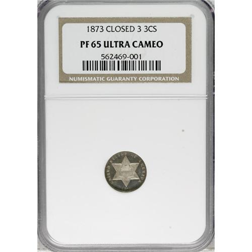 <B>1873 3CS PR65 Ultra Cameo NGC.</B></I> Closed 3. Crisply struck with glassy fields and richly frosted devices. A light layer of gold patina lies across each side, enhancing the overall visual appeal of the piece. A few faint die lines in the upper right obverse field are not distracting. This is a popular proof-only issue with a tiny mintage of 600 pieces. Currently the finest-graded example at NGC, and one of only two coins to be certified by that service as Ultra Cameo. Census: 1 in 65 Deep Cameo, 0 finer (3/07).<BR><BR><b>Shipping:</b> Coins & Currency (<a target="_blank" href="http://www.heritageauctions.com/common/shipping.php">view shipping information</a>)