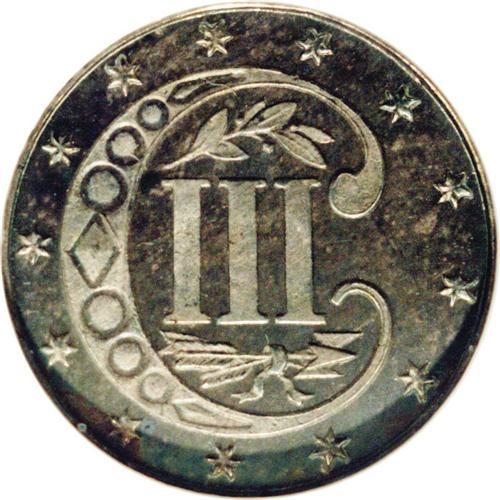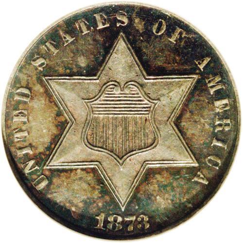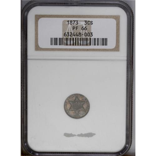 <B>1873<3CS> PR66 NGC.</B></I> A deeply toned Gem proof that is bathed in russet-blue toning throughout with matching hues on the frosty gray devices. The eye appeal and quality of this coin is very high even for this lofty grade. Final year of issue for this type. Census: 24 in 66, 5 finer (1/06).<BR><I>From The Larj Collection.</B></I>