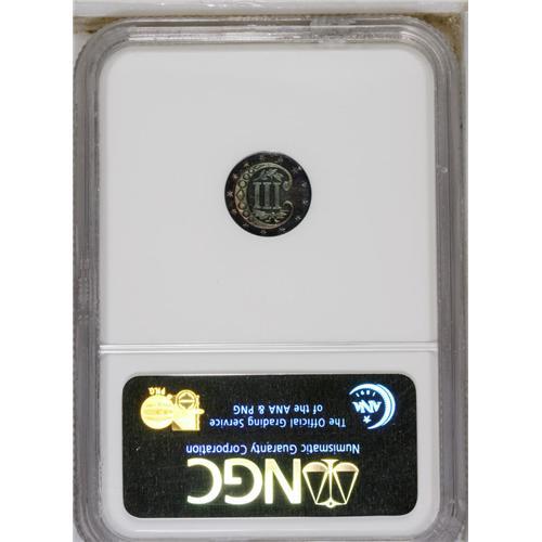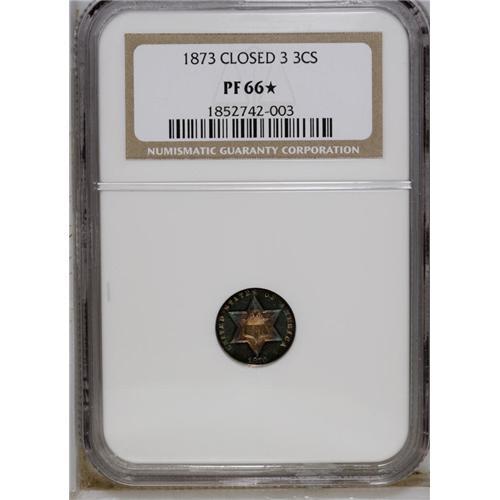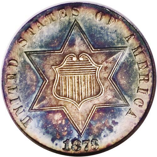 <B>1873 3CS PR66 <img border='0' src='http://www.heritagecoins.com/images/star.gif' width=10 height=10> NGC.</B></I> All examples of the silver three cent coin dated 1873 were struck in proof, and always with a Close or Closed 3 date style. This glittering little Gem has exquisite album or cabinet toning with concentric rings of heather, pale yellow, sea-green, sky-blue, and gold on the obverse. The reverse has blue, rose, amber, and turquoise color. NGC has assigned the coveted <img border='0' src='http://www.heritagecoins.com/images/star.gif' width=10 height=10> designation for eye appeal. Only five examples of this date have received such a designation from NGC (10/06): PR65 S, PR66 S, PR67 S, PR66 Cameo S, PR67 Cameo S.<BR><BR><b>Shipping:</b> Coin/Currency (<a target="_blank" href="http://www.heritageauctions.com/common/shipping.php">view shipping information</a>)