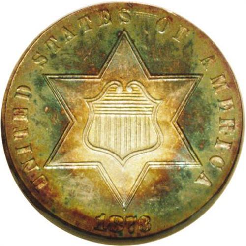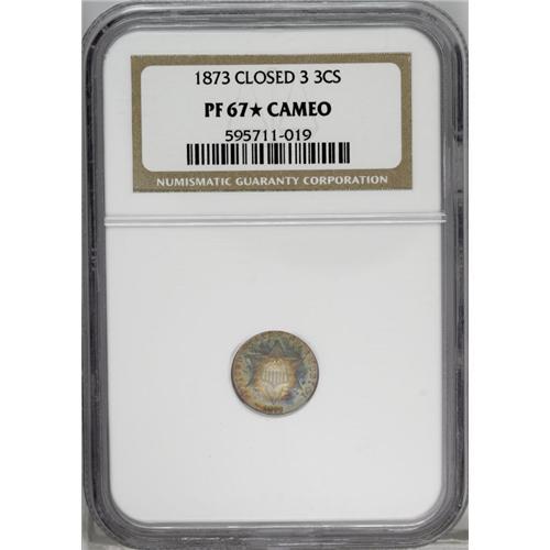 <B>1873<3CS> PR67 Cameo <img border='0' src='http://www.heritagecoins.com/images/star.gif' width=10 height=10> NGC.</B></I> This proof-only issue of 600 pieces was struck during the final year of the three cent silver series. The three cent nickel remained an active type through 1889, when the denomination was retired. The current example is a marvelously well made specimen, colorfully toned with bright, undamaged surfaces. The fields are highly reflective, with abundant cobalt-blue and antique-golden patina, while the completely outlined devices are pristine. This visually pleasing Gem is one of the finest known at NGC, where it is the only coin to be graded as PR67 <img border='0' src='http://www.heritagecoins.com/images/star.gif' width=10 height=10> Cameo. PCGS has also certified just one example at the current level with none graded higher by either service (3/06). <BR><BR><B>Important notice:</B> Heritage usually auctions material at the rate of 200-250 lots per hour. On some occasions eBay Live bid software or the Internet may not be able to keep up with the pace of the auction. We recommend placing a realistic absentee bid now as insurance to avoid disappointment. Occasionally the auctioneer may eliminate or reject an eBay Live bid, and the auctioneer may also reopen a lot after the close of the eBay live bidding (usually because we missed an audience bid), and may reject your bid even if it shows you as the winning bidder. By bidding via eBay Live, you agree that Heritage may award the lot to another bidder at its sole discretion under the circumstances described above or any other reasonable circumstances. Since eBay bids are not shown to us until we open the lot on the floor, we treat those bids just like floor bids. In most cases the floor responds before the eBay bid is presented to us, due to Internet lag time, so for consistency we have made it a policy that floor bids are always considered first over tie eBay live bids. Also please note that all Heritage lots purchased through eBay Live carry a 20% Buyer's Premium. Please make sure you read the Terms and Conditions before you bid. This lot is being auctioned in conjunction with a live floor auction by Heritage Galleries & Auctioneers. All final auction and invoice information will be supplied by Heritage Galleries & Auctioneers, and all other information should be considered preliminary. Lot:780 <BR><BR><B>Winning Notification and Billing:</B> After the FINAL session in this auction is complete, Heritage will send e-mail and snail mail invoices. This process normally takes several days. All final auction and invoice information will be supplied by Heritage Galleries & Auctioneers, and all other information should be considered preliminary. <BR><BR>This auction will be conducted on a live auction floor and over the Internet through eBay Live. If you choose to place an absentee bid, please take a moment to <font color='#0000ff'><u><a href='http://pages.ebay.com/liveauctions/help/before/laabsentee.html'>learn how eBay Live absentee bidding works</a></u></font><font color='#000000'>