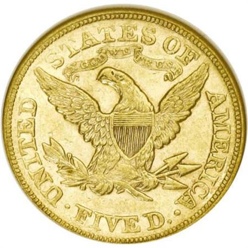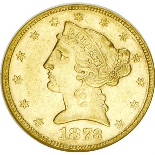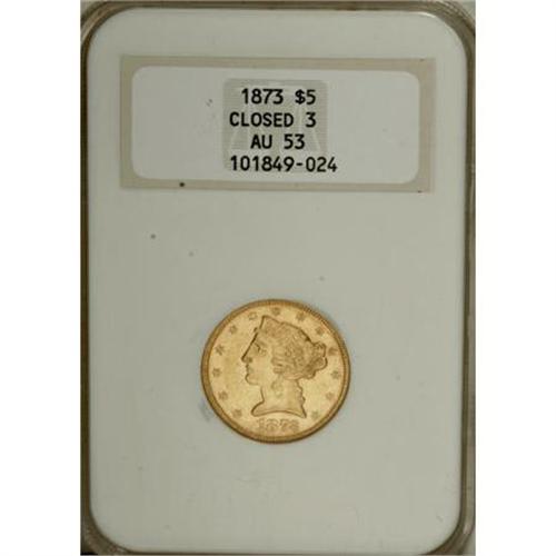 <B>1873 $5 Closed 3 AU53 NGC.</B></I> NGC Census: (18/227). PCGS Population (12/106). Numismedia Wsl. Price for NGC/PCGS coin in AU53: $279. (#8329)<BR><BR><B>Coin Engraver:</B> Christian Gobrecht<BR><BR><b>Shipping:</b> Coins & Currency (<a target="_blank" href="http://www.heritageauctions.com/common/shipping.php">view shipping information</a>)