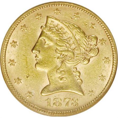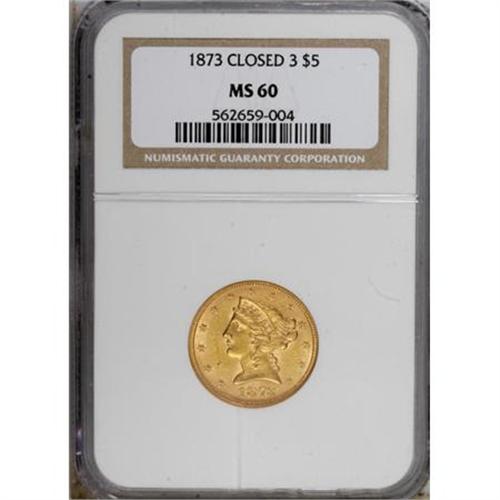 <B>1873 $5 Closed 3 MS60 NGC.</B></I> NGC Census: (16/62). PCGS Population (9/53). Numismedia Wsl. Price for NGC/PCGS coin in MS60: $825. (#8329)<BR><BR><B>Coin Engraver:</B> Christian Gobrecht<BR><BR><b>Shipping:</b> Coins & Currency (<a target="_blank" href="http://www.heritageauctions.com/common/shipping.php">view shipping information</a>)
