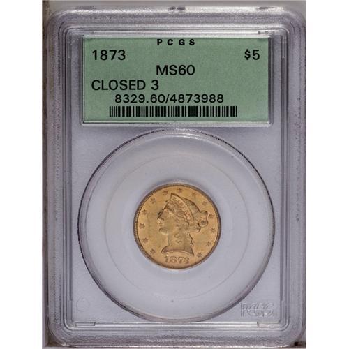 <B>1873<$5> Closed 3 MS60 PCGS.</B></I> The original orange surfaces are only moderately abraded for the basal Mint State grade. The strike is generally good, albeit a bit soft on portions of the devices. Encased in a green label holder. <BR><BR><B>Important notice:</B> Heritage usually auctions material at the rate of 200-250 lots per hour. On some occasions eBay Live bid software or the Internet may not be able to keep up with the pace of the auction. We recommend placing a realistic absentee bid now as insurance to avoid disappointment. Occasionally the auctioneer may eliminate or reject an eBay Live bid, and the auctioneer may also reopen a lot after the close of the eBay live bidding (usually because we missed an audience bid), and may reject your bid even if it shows you as the winning bidder. By bidding via eBay Live, you agree that Heritage may award the lot to another bidder at its sole discretion under the circumstances described above or any other reasonable circumstances. Since eBay bids are not shown to us until we open the lot on the floor, we treat those bids just like floor bids. In most cases the floor responds before the eBay bid is presented to us, due to Internet lag time, so for consistency we have made it a policy that floor bids are always considered first over tie eBay live bids. Also please note that all Heritage lots purchased through eBay Live carry a 20% Buyer's Premium. Please make sure you read the Terms and Conditions before you bid. This lot is being auctioned in conjunction with a live floor auction by Heritage Galleries & Auctioneers. All final auction and invoice information will be supplied by Heritage Galleries & Auctioneers, and all other information should be considered preliminary. Lot:2785 <BR><BR><B>Winning Notification and Billing:</B> After the FINAL session in this auction is complete, Heritage will send e-mail and snail mail invoices. This process normally takes several days. All final auction and invoice information will be supplied by Heritage Galleries & Auctioneers, and all other information should be considered preliminary. <BR><BR>This auction will be conducted on a live auction floor and over the Internet through eBay Live. If you choose to place an absentee bid, please take a moment to <font color='#0000ff'><u><a href='http://pages.ebay.com/liveauctions/help/before/laabsentee.html'>learn how eBay Live absentee bidding works</a></u></font><font color='#000000'>