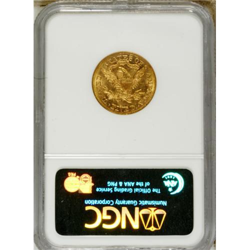 <B>1873 $5 Closed 3 MS61 NGC.</B></I> Considered the rarer of the two logotypes. The flash of the yellow-gold reverse counterbalances the apricot-tinged obverse's subtle luster. Well struck with myriad grade-defining marks over each side. Census: 32 in 61, 37 finer (3/07).<BR><BR><b>Shipping:</b> Coins & Currency (<a target="_blank" href="http://www.heritageauctions.com/common/shipping.php">view shipping information</a>)