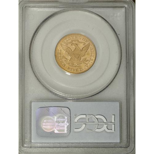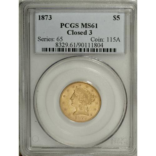 <B>1873 $5 Closed 3 MS61 PCGS.</B></I> Gold production at Philadelphia ramped up in 1873, partly due to a Treasury belief that Federal paper would soon trade at par with gold coin. The 1873 half eagle is nonetheless scarce, and the Closed 3 is the more difficult variety. This generally lustrous example is noteworthy for a strike-through on the field above FIVE. Population: 18 in 61, 29 finer (4/07).<BR><BR><b>Shipping:</b> Coins & Currency (<a target="_blank" href="http://www.heritageauctions.com/common/shipping.php">view shipping information</a>)