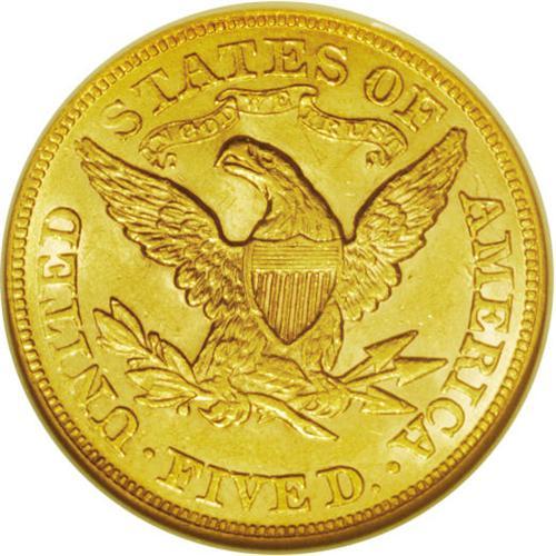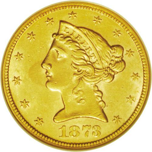 <B>1873<$5> Closed 3 MS62 NGC.</B></I> A bold striking with bright, frosty luster and an appealing reddish tint. The obverse exhibits a touch of scuffiness while field marks surrounding the eagle are more noticeable on the reverse. Census: 19 in 62, 7 finer (4/06).