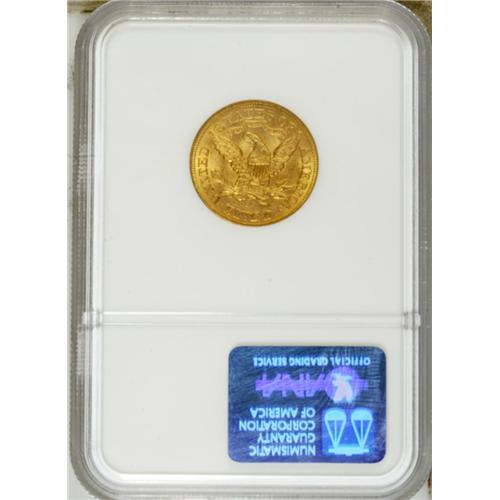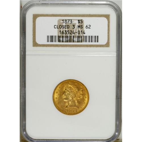 <B>1873 $5 Closed 3 MS62 NGC.</B></I> Vivid orange-gold fields are the hallmark of this well struck example, though an area of pale green is noted to the left of the portrait. Minimally marked and appealing for the grade. Census: 29 in 62, 7 finer (1/07).<BR><BR><b>Shipping:</b> Coins & Currency (<a target="_blank" href="http://www.heritageauctions.com/common/shipping.php">view shipping information</a>)