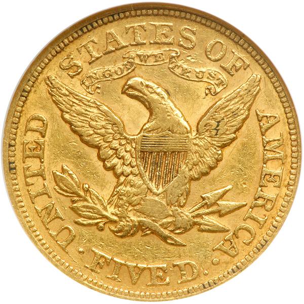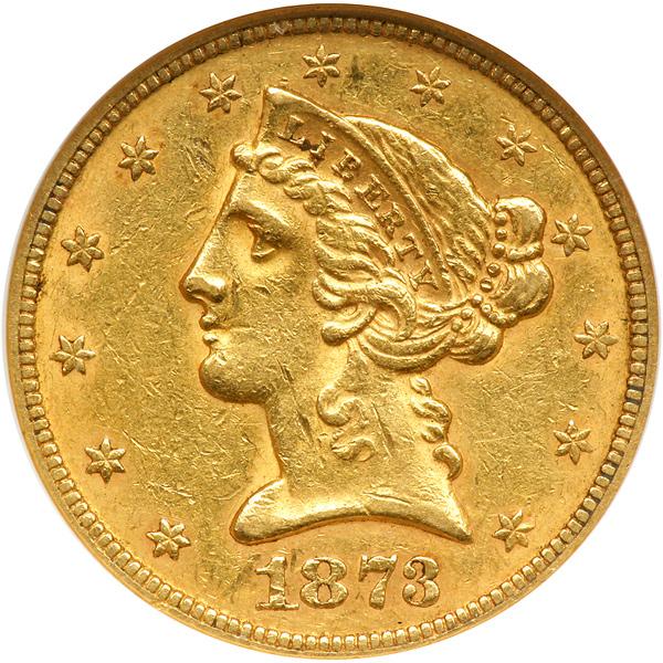 1873 $5 Liberty. Closed 3. NGC graded AU-53. Lightly toned, a lustrous example of this scarcer issue. Between 1861 and 1879, when gold "parity" was restored to U.S. paper money, mintage of gold coins was restricted. Moreover, people rarely saw actual gold coins in circulation in those years. Much of the gold that was minted served in payment for exports (PCGS # 8329) .
