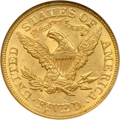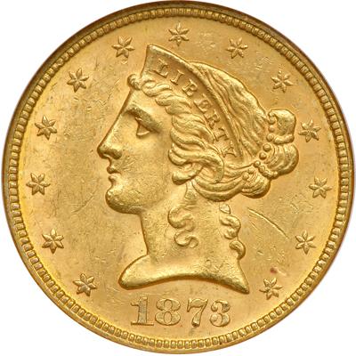 1873 $5 Liberty. NGC graded MS-62. Closed 3. CAC Approved. Displays subtle golden tones over frosty luster. A small mark is seen in the field below the hair bun; another near the E in FIVE on the reverse. Scarce: Pop 20; 12 finer, 3 in 63, 6 in 64, 1 in 65, 2 in 66.