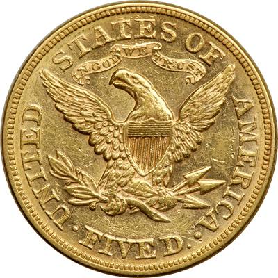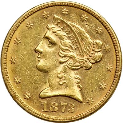 1873 $5 Liberty. Open 3. NGC graded AU-58. Light rose toning about the borders. Mintage: 112,505 (PCGS # 8328) .