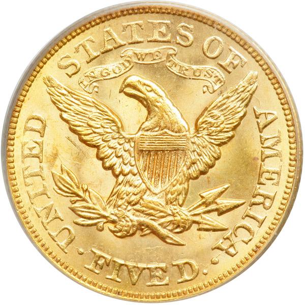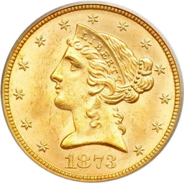 1873 $5 Liberty. Open 3. PCGS graded MS-65. Among the finest known. A highly lustrous specimen with rich orange-gold iridescence on satiny surfaces. In the same grade as the famed Harry Bass, Jr. specimen in MS65 and just as nicely struck, we might add. The Bass coin has a planchet flaw, however (below IN GOD), while this one doesn't.