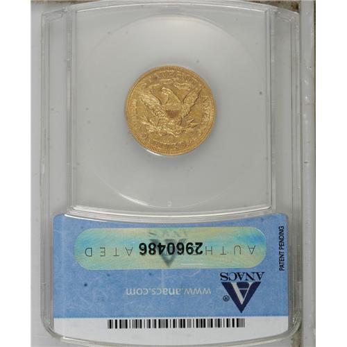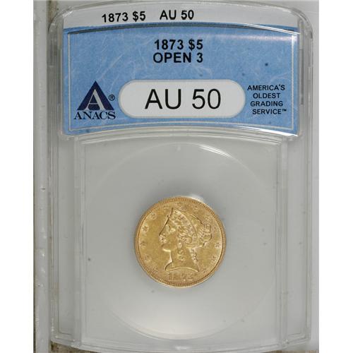 1873 $5 Open 3 AU50 ANACS. NGC Census: (26/176). P