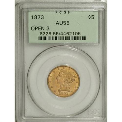 1873 $5 Open 3 AU55 PCGS. PCGS Population (31/63).