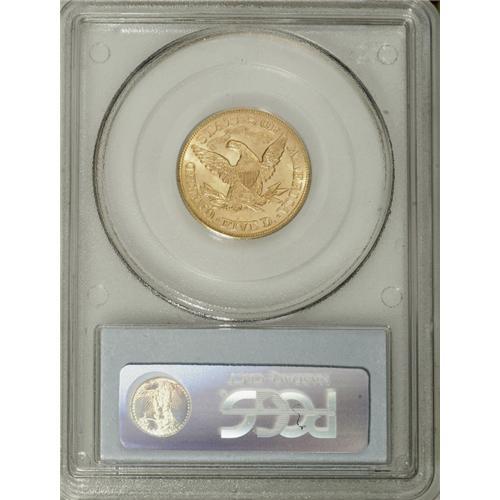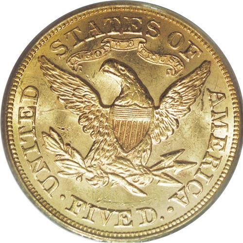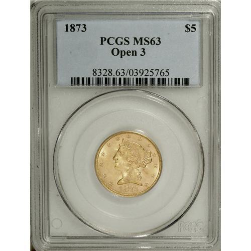<B>1873 $5 Open 3 MS63 PCGS.</B></I> The Open 3 variant was struck between November 19 and 29, 1873. These pieces are slightly scarcer overall than their Closed 3 counterpart, and they are notably lacking in the better grades of Mint State. Only nine other pieces have been so graded by PCGS with eight finer (4/07). The obverse of this coin is fully struck, while the reverse shows slight softness on the eagle's neck. The bright, lustrous, yellow-gold surfaces are lightly marked on the obverse.<BR><BR><b>Shipping:</b> Coins & Currency (<a target="_blank" href="http://www.heritageauctions.com/common/shipping.php">view shipping information</a>)
