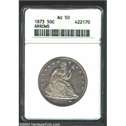 1873 50C Arrows AU50 ANACS. WB-106, Large Arrows. Well struck, with attractive peripheral violet patina. Both sides have abundant bright luster. The fields are lightly abraded, but there are no individually mentionable abrasions.From the Ohio Collection. Important notice: We expect to be auctioning lots at the rate of 200-250 per hour. Sometimes eBay Premier live bid software cannot keep up with that pace, so we strongly recommend that you place a realistic proxy bid now as insurance to avoid disappointment. Also please note that all Heritage/CAA lots purchased through eBay Premier carry a 20% Buyer's Premium. Please make sure you read the Terms and Conditions.