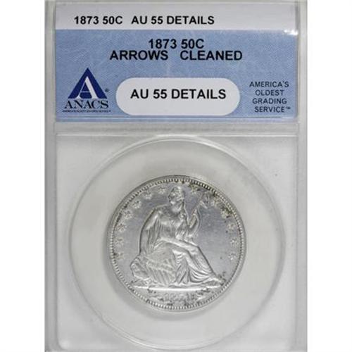 <B>1873 50C Arrows--Cleaned--ANACS. AU55 Details.</B></I> NGC Census: (15/133). PCGS Population (18/138). Mintage: 1,815,700. Numismedia Wsl. Price for NGC/PCGS coin in AU55: $420. (#6343)<BR><BR><B>Coin Engraver:</B> Christian Gobrecht<BR><BR><b>Shipping:</b> Coins & Currency (<a target="_blank" href="http://www.heritageauctions.com/common/shipping.php">view shipping information</a>)