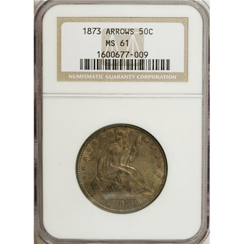 <B>1873 50C Arrows MS61 NGC.</B></I> A luminous and richly toned representative of this Arrows type issue. Well struck with deep gold, lavender, and silver-gray patina over each side. Minimally marked for the grade. Census: 21 in 61, 77 finer (4/07).<BR><BR><b>Shipping:</b> Coins & Currency (<a target="_blank" href="http://www.heritageauctions.com/common/shipping.php">view shipping information</a>)
