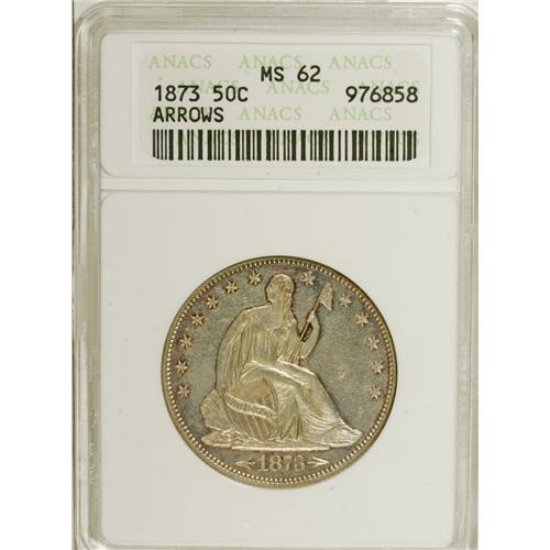 <B>1873 50C Arrows MS62 ANACS.</B></I> WB-109, FS-1101, formerly FS-007.1. The "Quad Stripes" doubled die obverse, as described in the <I>Cherrypicker's Guide.</B></I> Aside from the stars to the right, the devices are sharp, and the lightly toned fields have strong reflectivity and only minor abrasions.<BR><BR><b>Shipping:</b> Coins & Currency (<a target="_blank" href="http://www.heritageauctions.com/common/shipping.php">view shipping information</a>)