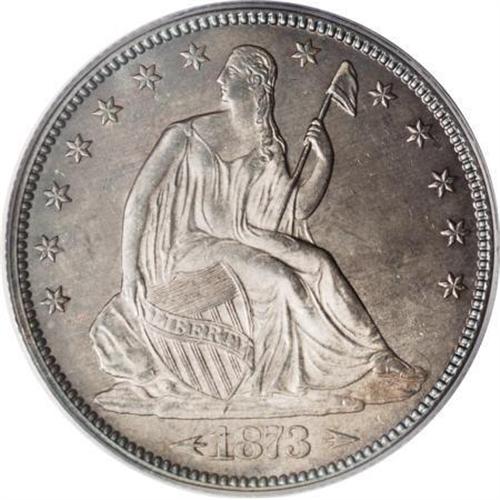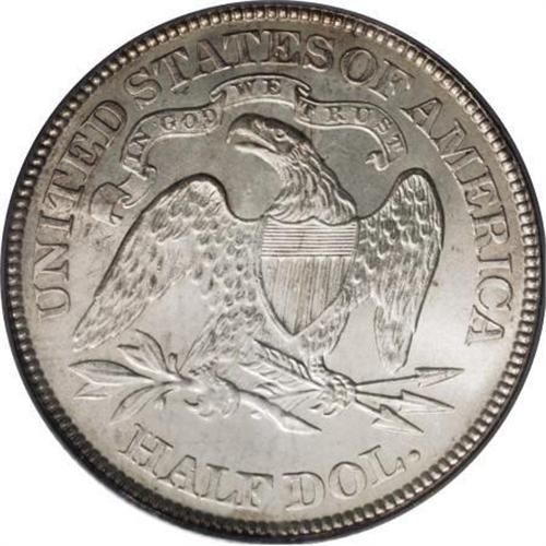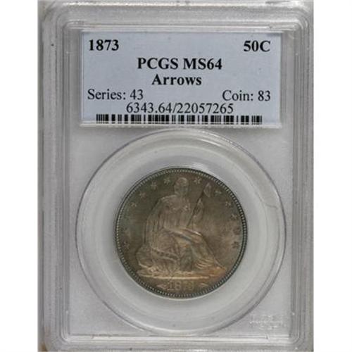 <B>1873 50C Arrows MS64 PCGS.</B></I> WB-107, Small Arrows. Dusky apricot and aqua-blue colors do not deny the unbroken satin luster. Well struck save for the hair on Liberty's forehead. A carefully preserved representative of this important short-lived type, which is surprisingly scarce in better Mint State grades.<BR><BR><B>Coin Engraver:</B> Christian Gobrecht<BR><BR><b>Shipping:</b> Coins & Currency (<a target="_blank" href="http://www.heritageauctions.com/common/shipping.php">view shipping information</a>)