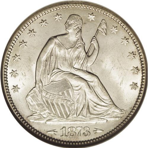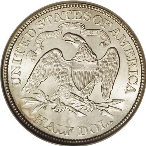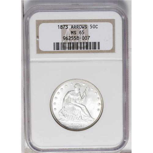 <B>1873<50C> Arrows MS65 NGC.</B></I> WB-107. Small Arrows. A dash of tan is found near 7 o'clock on the reverse, but the remainder of this thoroughly lustrous Gem is stone-white. Beautifully preserved, since grazes are few, and localized to the right obverse field. The devices are suitably brought up, with any weakness relegated to Liberty's hair, the eagle's left (facing) claw, and the left half of the right side stars. The scarcer of the two Philadelphia Mint issues of the type. While the No Motto, Arrows type often hubbed the date and arrows, this step wasn't taken for the later Motto, Arrows type. Small and Large Arrows varieties resulted. Census: 7 in 65, 3 finer (7/06).