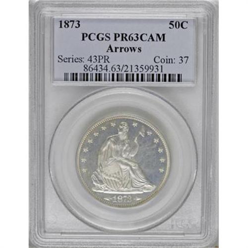 <B>1873 50C Arrows PR63 Cameo PCGS.</B></I> Large Arrows. A lightly toned and attractive example of this challenging two-year proof type. Minor inexactness of strike is noted on the eagle's left (facing) ankle, and careful examination of the obverse field locates a few faint hairlines. Only 550 proofs were struck. Population: 7 in 63 Cameo, 13 finer (11/07).<BR><I>From The Kallenberg #1 PCGS Registry Set Of Proof Half Dollars.</B></I><BR><BR><b>Shipping:</b> Coins & Currency (<a target="_blank" href="http://www.heritageauctions.com/common/shipping.php">view shipping information</a>)