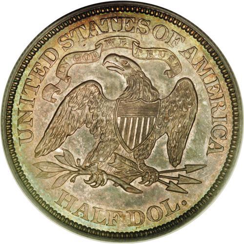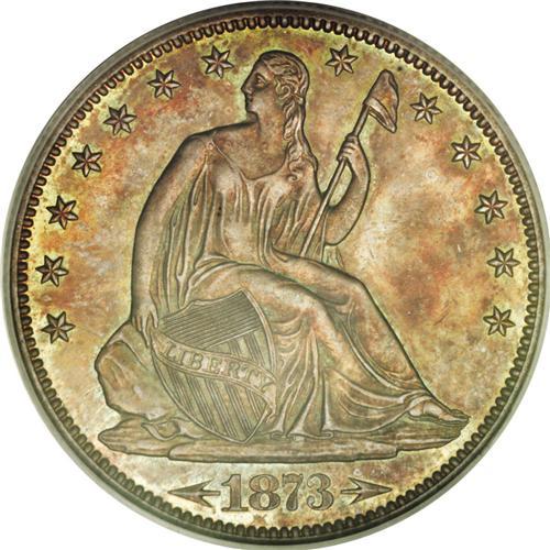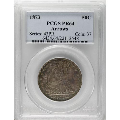 <B>1873 50C Arrows PR64 PCGS.</B></I> Pumpkin-gold, lime-green, and gunmetal-gray toning blankets this nicely struck and flashy near-Gem. An impressive Seated proof type coin from the lower mintage of only two proof Motto, Arrows dates. Just 550 proofs were struck. Population: 42 in 64, 10 finer (11/06).<BR><BR><b>Shipping:</b> Coin/Currency (<a target="_blank" href="http://www.heritageauctions.com/common/shipping.php">view shipping information</a>)