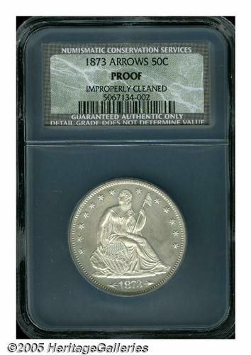 <B>1873<50C> Arrows Proof, Improperly Cleaned, NCS.</B></I> Patches of hairlines are noted near the cap, TRUST, and HALF. The boldly struck devices exhibit moderate cameo frost. An untoned example of this scarce proof type. A mere 550 specimens were struck.