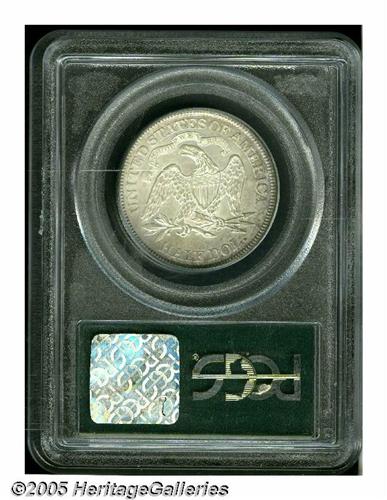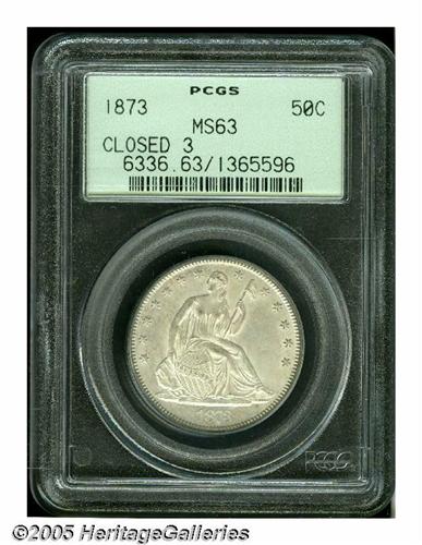 <B>1873<50C> Closed 3, No Arrows MS63 PCGS.</B></I> Light pearl-gray and russet patina. The strike is very good, although not razor sharp on the fletchings and left (facing) claw. The luster is diminished slightly on the obverse field. Housed in a green label holder. A scarce issue in Mint State.<BR><I>From the Dr. Kurt Peters Collection.</B></I> From the Dr. Kurt Peters Collection.