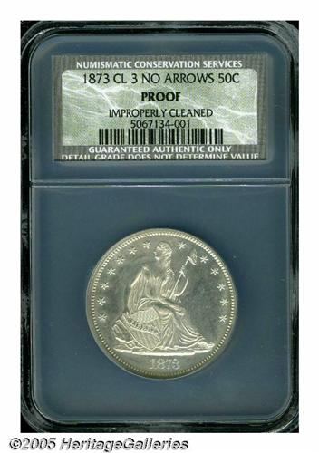 <B>1873<50C> Closed 3, No Arrows Proof, Improperly Cleaned, NCS.</B></I> A sharply struck and untoned specimen with wispy hairlines on the fields. Only 600 proofs are reported struck without Arrows; an additional 550 Open 3, Arrows proofs were subsequently issued.