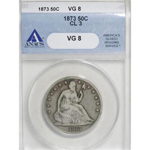<B>1873 50C Closed 3, No Arrows VG8 ANACS.</B></I> . NGC Census: (0/49). PCGS Population (0/58). Mintage: 587,000. Numismedia Wsl. Price for NGC/PCGS coin in VG8 : $41. (#6336)<BR><BR><B>Coin Engraver:</B> Christian Gobrecht<BR><BR><b>Shipping:</b> Coins & Currency (<a target="_blank" href="http://www.heritageauctions.com/common/shipping.php">view shipping information</a>)