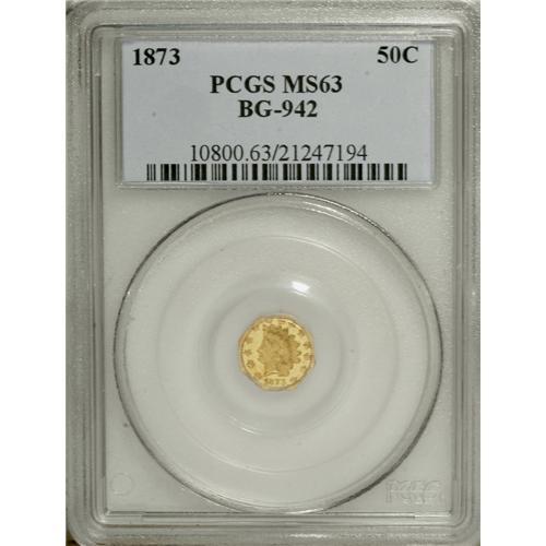 <B>1873 50C Indian Octagonal 50 Cents, BG-942, Low R.5, MS63 PCGS.</B></I> PCGS Population (16/11). NGC Census: (0/0). (#10800)<BR><BR><b>Shipping:</b> Coins & Currency (<a target="_blank" href="http://www.heritageauctions.com/common/shipping.php">view shipping information</a>)