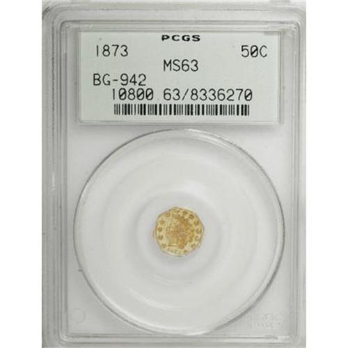 <B>1873 50C Indian Octagonal 50 Cents, BG-942, Low R.5, MS63 PCGS.</B></I> A flashy orange and straw-gold example with smooth surfaces. The reverse displays peripheral "ghosts" from the obverse stars, as discussed in the second edition of Breen-Gillio. In an old green label holder. Population: 16 in 63, 11 finer (12/07).<BR><BR><b>Shipping:</b> Coins & Currency (<a target="_blank" href="http://www.heritageauctions.com/common/shipping.php">view shipping information</a>)