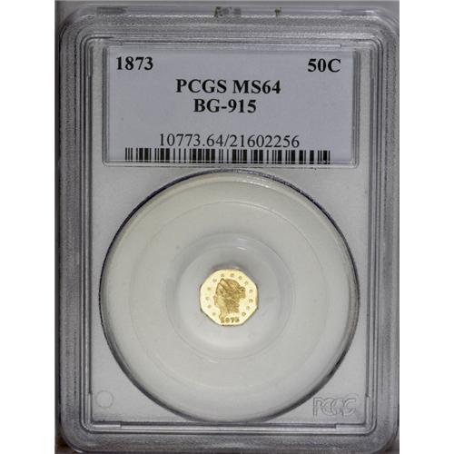 <B>1873<50C> Liberty Octagonal 50 Cents, BG-915, Low R.4, MS64 PCGS.</B></I> A very scarce piece, but usually found in higher grades than some other issues. This sharply struck example has lustrous yellow-orange surfaces. Population: 34 in 64, 26 finer (7/06).