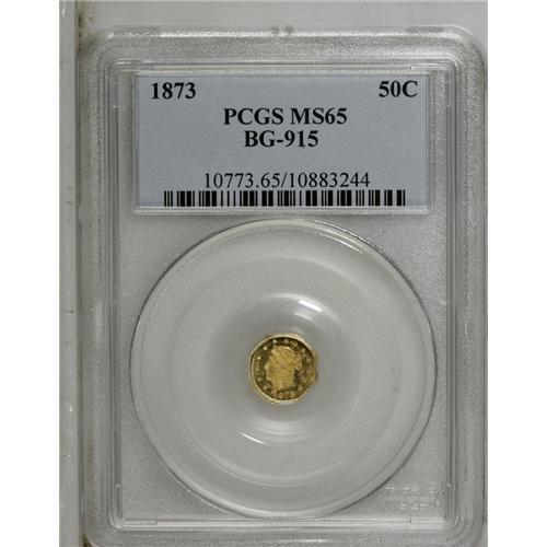 <B>1873 50C Liberty Octagonal 50 Cents, BG-915, Low R.4, MS65 PCGS.</B></I> A yellow-gold Gem example of this very scarce variety that has heavily frosted devices and the usual semiprooflike fields. Population: 25 in 65, 2 finer (10/06).<BR><BR><b>Shipping:</b> Coin/Currency (<a target="_blank" href="http://www.heritageauctions.com/common/shipping.php">view shipping information</a>)