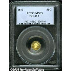 <B>1873 50C Liberty Octagonal 50 Cents, BG-915, Low R.4, MS65 PCGS.</B></I> The 'Baby Head' motif, Liberty has a flat profile and her mouth is open. Crisply struck and flashy, a staple scratch near 1 o'clock on the reverse is distant from the focal points. Population: 24 in 65, 2 finer (2/05).