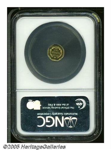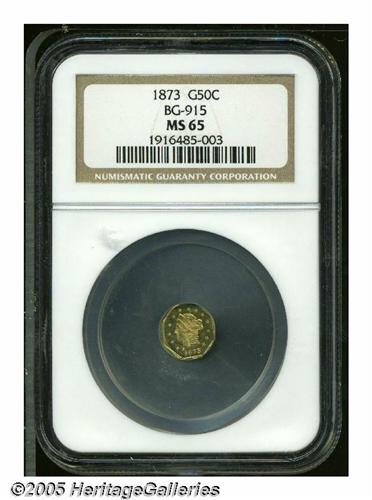 <B>1873<50C> Liberty Octagonal 50 Cents, BG-915, Low R.4, MS65 NGC.</B></I> Yellow-gold in color with freckles of peach patina at the central reverse. A bright and prooflike piece that features a sharp strike, attractive preservation, and almost medallic die alignment.