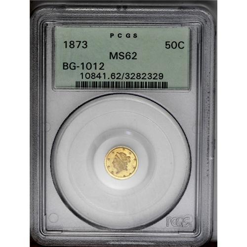 <B>1873<50C> Liberty Round 50 Cents, BG-1012, High R.5, MS62 PCGS.</B></I> Rose highlights grace the devices, and the fields are honey-gold. This crisply struck piece is unmarked and attractive. Housed in a green label holder.