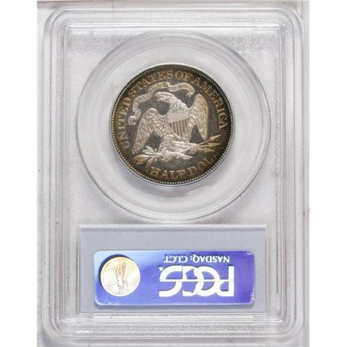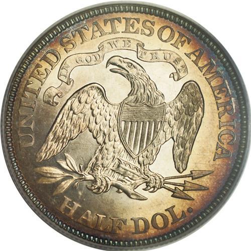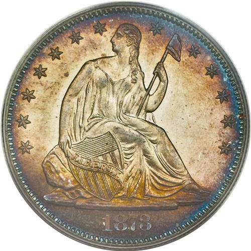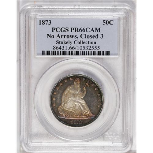 <B>1873<50C> No Arrows, Closed 3 PR66 Cameo PCGS.</B></I> Breen-4969, WB-102. The obverse die shows a small lump in Liberty's lap, and the knobs of the 3 digit nearly touch. This lovely coin has bull's-eye toning on each side, with silver centers that deepen to amber-gold, copper, magenta, and steel-blue at the rims. A couple of dark toning flecks, including one near the 7 in the date, are small and unimportant, but mentioned for pedigree purposes. The profoundly mirrored fields provide stark contrast to the frosty devices, and the coin is free of mentionable impairments. A couple of light die lines join the eagle's right (facing) wing to the scroll end beneath ST in TRUST. PCGS has graded two pieces in PR66 Cameo, with one finer (6/06).<BR><I>From The Stephen Stokely #1 PCGS Registry Set of Proof Seated Half Dollars.</B></I>