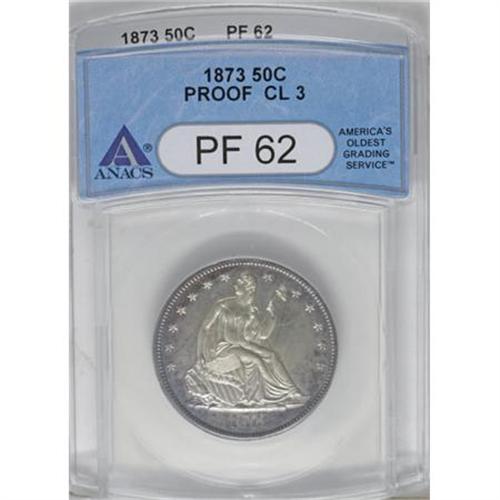<B>1873 50C Close 3 No Arrows PR62 ANACS.</B></I> NGC Census: (21/94). PCGS Population (34/103). Mintage: 600. Numismedia Wsl. Price for NGC/PCGS coin in PR62: $505. (#6431)<BR><BR><B>Coin Engraver:</B> Christian Gobrecht<BR><BR><b>Shipping:</b> Coins & Currency (<a target="_blank" href="http://www.heritageauctions.com/common/shipping.php">view shipping information</a>)