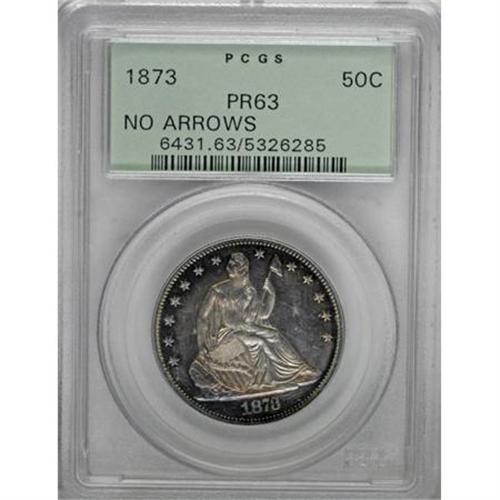 <B>1873 50C No Arrows PR63 PCGS.</B></I> Crisply struck on all of the design elements, including Liberty's hair and shield stripes. Beautifully deep peripheral toning in shades of charcoal, purple, and electric-blue emerges near the peripheries, while the central devices remain bright and provide undesignated cameo contrast. The right obverse field displays faint hairlines. Housed in a green label holder.<BR><BR><B>Coin Engraver:</B> Christian Gobrecht<BR><BR><b>Shipping:</b> Coins & Currency (<a target="_blank" href="http://www.heritageauctions.com/common/shipping.php">view shipping information</a>)