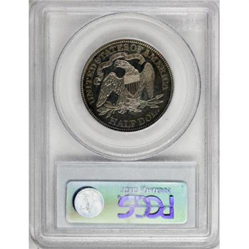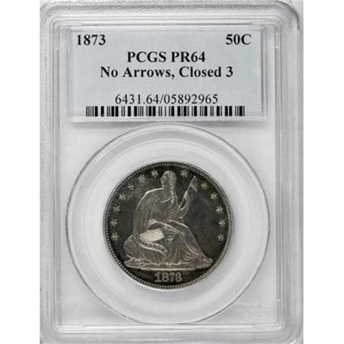 <B>1873 50C No Arrows PR64 PCGS.</B></I> Closed 3. Electric-blue and sea-green borders frame the tan-gray fields. The devices are only faintly toned. Moderate contrast is present, although the piece is undesignated as Cameo. An unobtrusive mint-made planchet streak crosses through the lower portion of the right (facing) wing. Only 600 No Arrows proofs were issued. Population: 32 in 64, 28 finer (12/07).<BR><BR><B>Coin Engraver:</B> Christian Gobrecht<BR><BR><b>Shipping:</b> Coins & Currency (<a target="_blank" href="http://www.heritageauctions.com/common/shipping.php">view shipping information</a>)