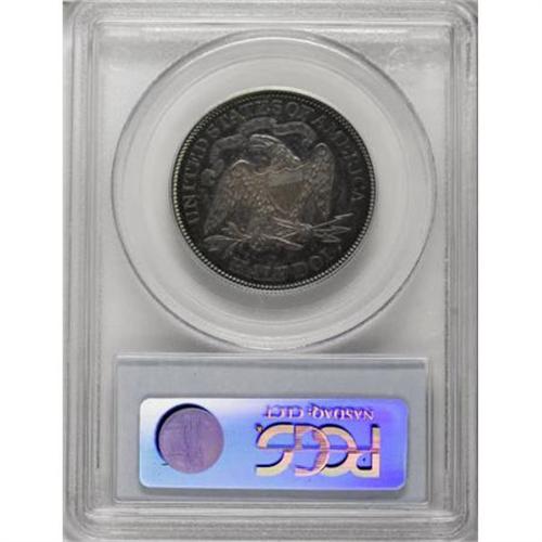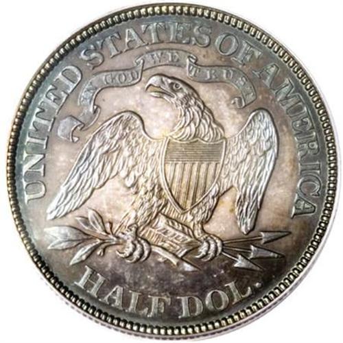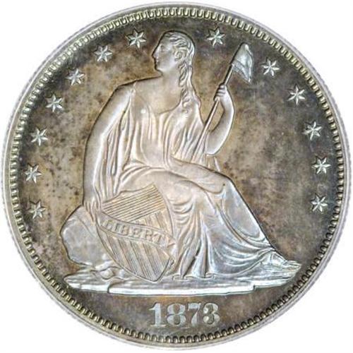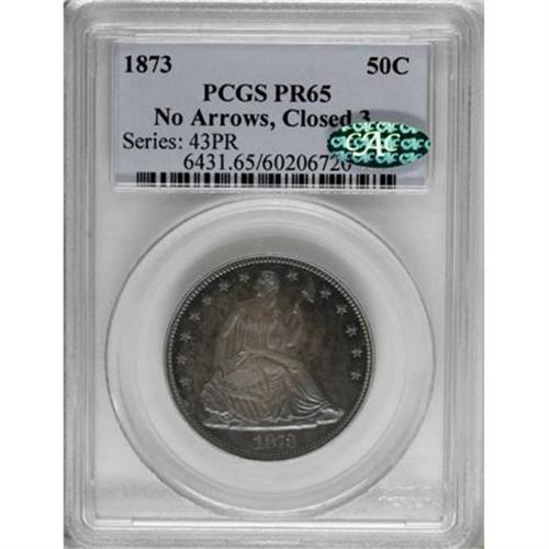 <B>1873 50C No Arrows PR65 PCGS. CAC.</B></I> Closed 3. Blue-green toning consumes much of this exactingly struck Gem, although dusky plum-red fills the open fields. Only 600 Closed 3, No Arrows proofs were struck, and these are separated collected from the 550 Open 3, Arrows proofs also made that year. Population: 18 in 65, 10 finer (11/07).<BR><I>From The Kallenberg #1 PCGS Registry Set Of Proof Half Dollars.</B></I><BR><BR><B>Coin Engraver:</B> Christian Gobrecht<BR><BR><b>Shipping:</b> Coins & Currency (<a target="_blank" href="http://www.heritageauctions.com/common/shipping.php">view shipping information</a>)