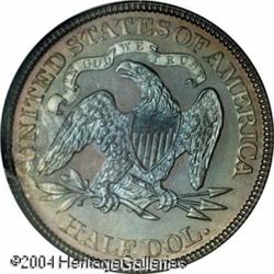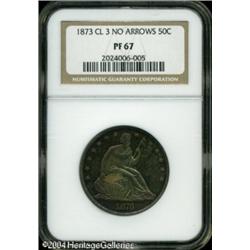 1873 50C No Arrows PR67 NGC. Gorgeous ruby-red, go <B>1873 50C No Arrows PR67 NGC.</B></I> Gorgeous ruby-red, gold, apple-green, and navy-blue colors enliven the obverse, while the reverse is also beautifully toned in peach and ocean-blue hues. A meticulously struck and splendidly preserved specimen. 600 proofs were struck at the old tenor (12.44 grams) with a Closed 3 and No Arrows, and an additional 550 Open 3 proofs were produced at a higher tenor (12.50 grams) with arrows bookending the date. The latter issue sells for substantially more due its status as a short-lived type. However, the No Arrows variety provides better value for similar rarity. Both services combined have only seen five in PR67, none finer (11/04). <BR><BR><B>Important notice:</B> Heritage usually auctions material at the rate of 200-250 lots per hour. On some occasions eBay Live bid software or the Internet may not be able to keep up with the pace of the auction. We recommend placing a realistic absentee bid now as insurance to avoid disappointment. Occasionally the auctioneer may eliminate or reject an eBay Live bid, and the auctioneer may also reopen a lot after the close of the eBay live bidding (usually because we missed an audience bid), and may reject your bid even if it shows you as the winning bidder. By bidding via eBay Live, you agree that Heritage may award the lot to another bidder at its sole discretion under the circumstances described above or any other reasonable circumstances. Since eBay bids are not shown to us until we open the lot on the floor, we treat those bids just like floor bids. In most cases the floor responds before the eBay bid is presented to us, due to Internet lag time, so for consistency we have made it a policy that floor bids are always considered first over tie eBay live bids. Also please note that all Heritage lots purchased through eBay Live carry a 20% Buyer's Premium. Please make sure you read the Terms and Conditions before you bid. This lot is being auctioned in conjunction with a live floor auction by Heritage Galleries & Auctioneers. All final auction and invoice information will be supplied by Heritage Galleries & Auctioneers, and all other information should be considered preliminary. Lot:6109